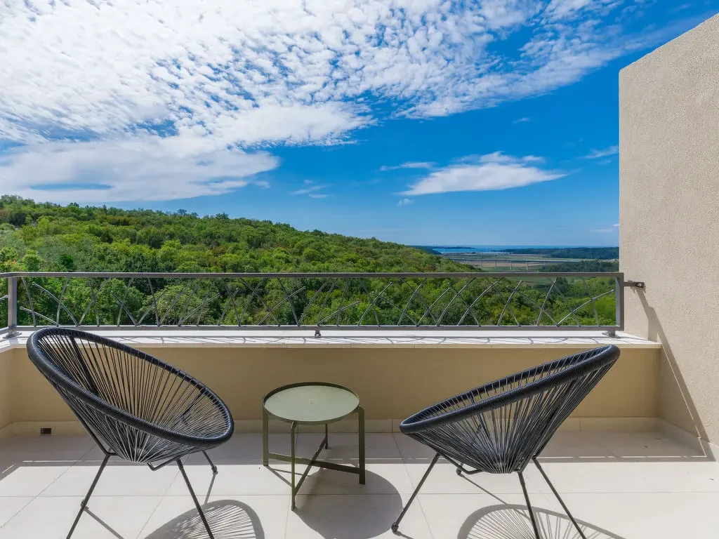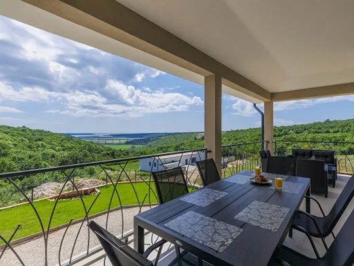 Gostima je na raspolaganju prostrano privatno imanje od 500 m² s pažljivo uređenim dvorištem i atraktivnim infinity bazenom dimenzija 8 x 4 m (dubine 140 cm). S bazena se pruža nevjerojatan, panoramski pogled na ušće rijeke Mirne, čarobnu dolinu Mirne i more u daljini, stvarajući jedinstven doživljaj potpunog mira i luksuza. Uz bazen se nalaze vanjski tuš, udobna vrtna garnitura i roštilj, idealni za uživanje u toplim danima i dugim ljetnim večerima na otvorenom.